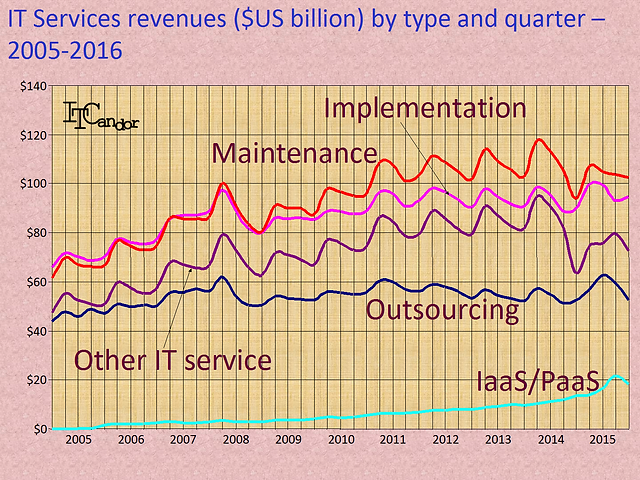 Traditional outsourcing looks very different to other services businesses such as HP’s Technical Services, which it is retaining. Contract lengths are longer (typically 3 to 5 years), with profits from each customer coming towards the end of that period, which makes renegotiating contracts impossible, difficult and/or expensive for customers. Other outsourcing experts, such as IBM, are managing a slow conversion of traditional to cloud-based outsourcing – not so HPE, which has decided to be a cloud builder and private cloud services supplier rather than open its own data centers from which to run general purpose IaaS and PaaS for customers. Customers often find the inflexibility of traditional outsourcing problematic in an IT world in which new opportunities get addressed by newer forms of op ex offerings: consequentially outsourcing revenues are declining more than most other services areas.
