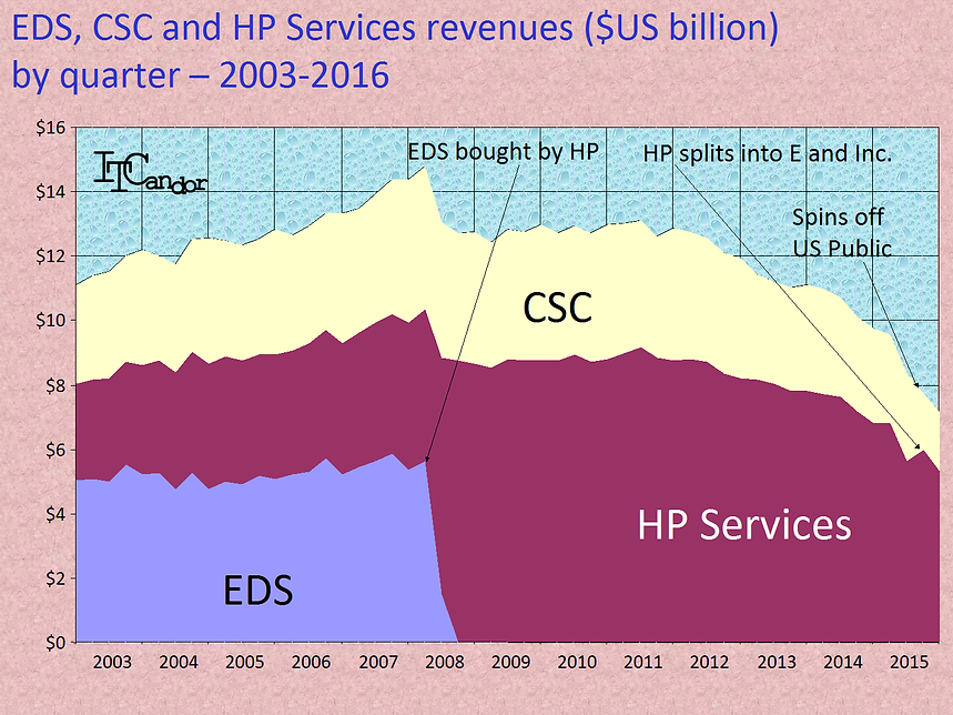 HP announced that it intends to spin off HP Services to US supplier CSC, The new company will be headed by CSC chairman, president and CEO Mike Lawrie. In the new organisation HPE’s leader Meg Whitman will have a seat on the board, and the other directors nominated 50:50 by HPE and CSC. HP acquired EDS in 2008 for around $13.9 billion (see my Figure for the combined revenues of EDS, CSC and HP Services. HPE claims it will save around $1b in the first year following a schedule which should see the deal completed in a year or so. You’ll want to learn more about the background history.