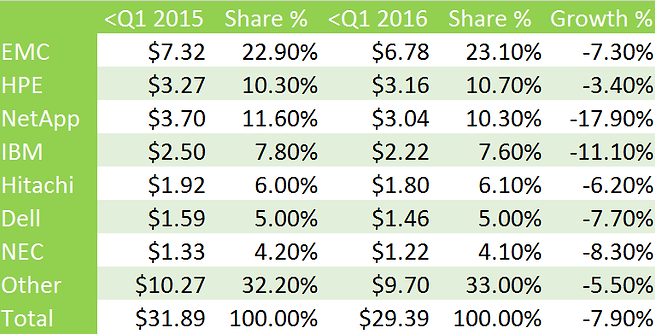 Table 1 – Storage Systems market shares – year to Q1 2015 v Q1 2016